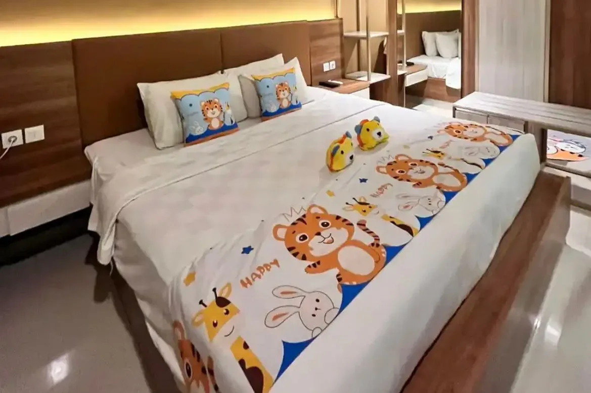 Tak hanya itu, hotel juga menyediakan playground outdoor, menu sarapan bento khusus anak, serta kolam renang indoor yang tetap bisa digunakan meski hujan turun. Konsep ini membuat pengalaman menginap terasa seperti berada di taman bermain tanpa harus meninggalkan area hotel.